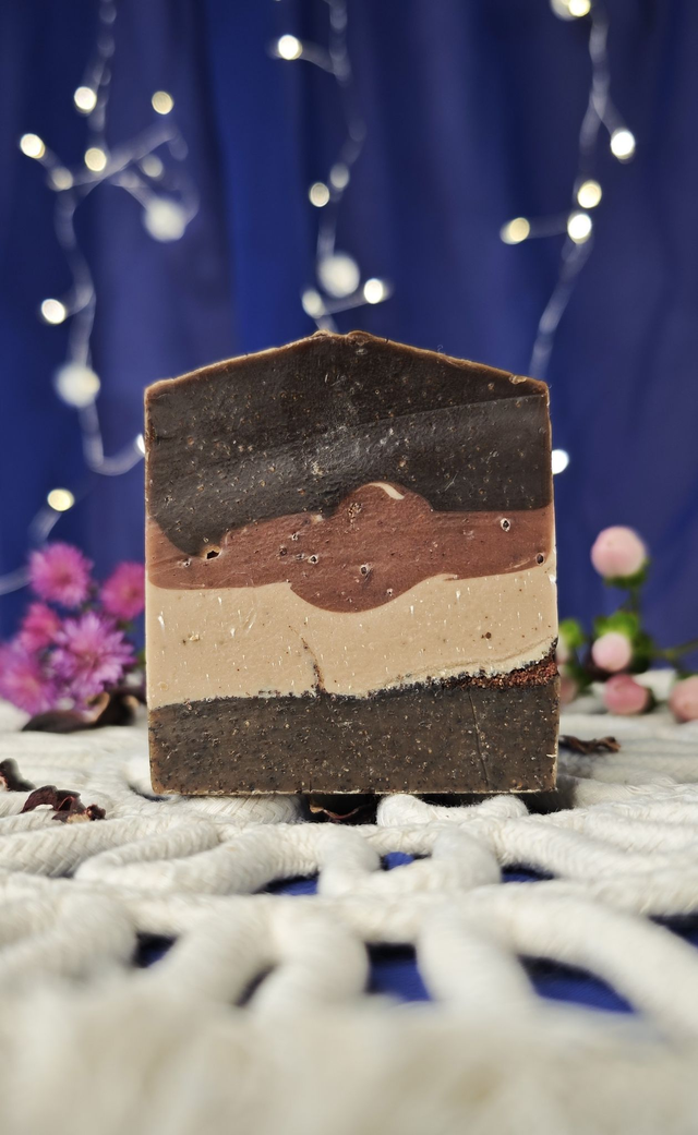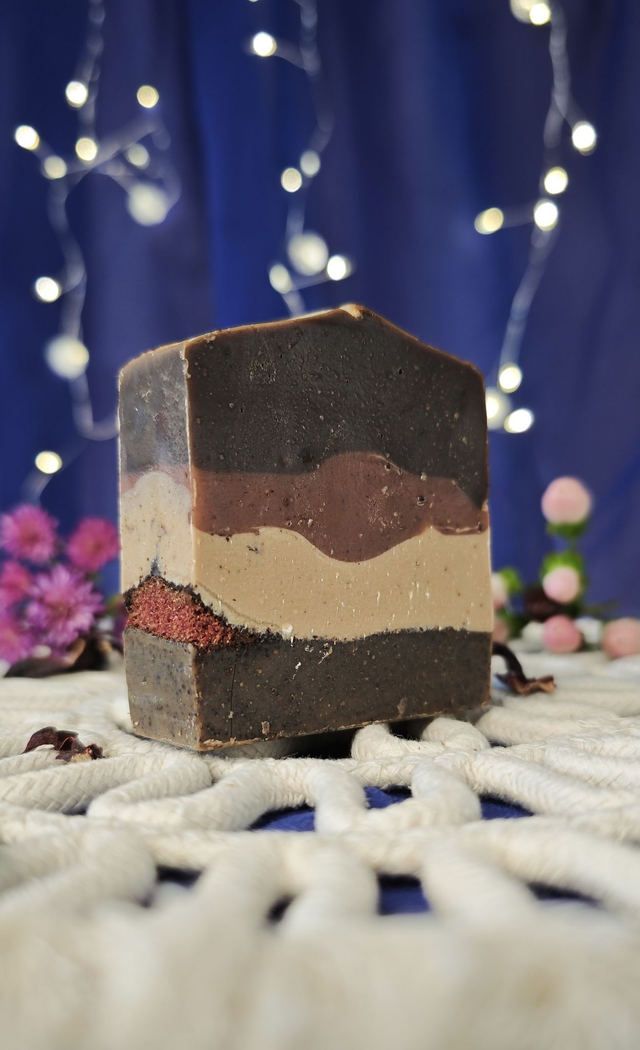 Handcrafted layered exfoliating soap with coffee, cranberry & cocoa