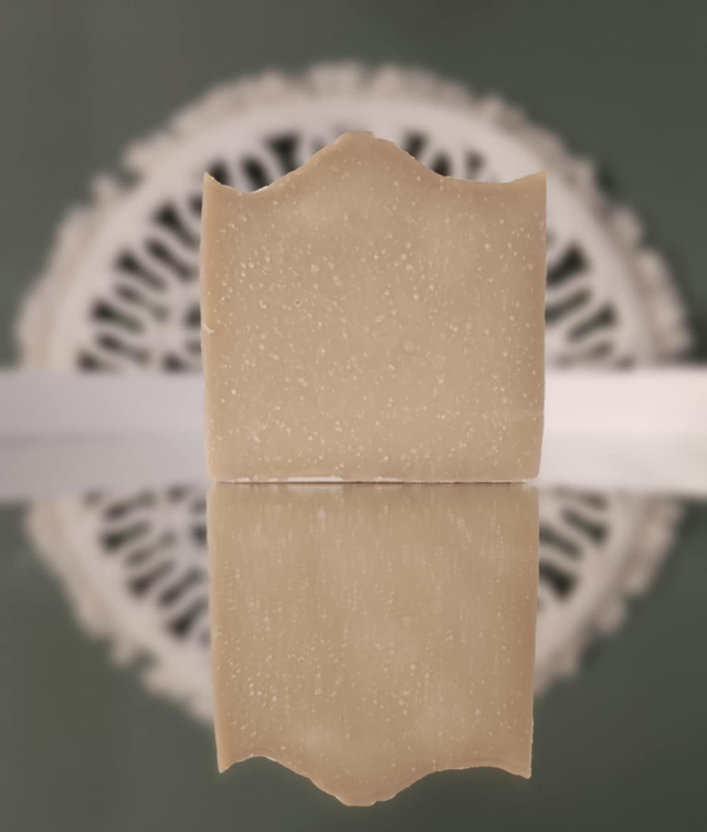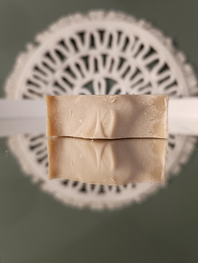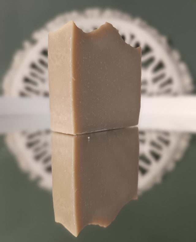 The bar has a firm structure and produces a dense, creamy lather that cleanses gently without stripping the skin.